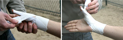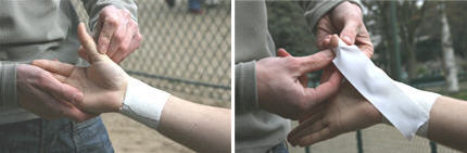 6. Refermez votre strapping en faisant le tour de la main avec la bande. L'incision de la bande va vous permettre de la faire passer de chaque côté du pouce. |